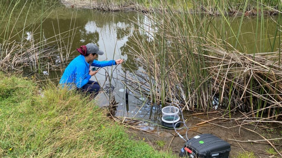 En el marco de nuestra investigación sobre flujos de gases de efecto invernadero en el humedal de Mantagua, registramos señales claras de una disminución del oxígeno disuelto en el agua, evidenciadas por un aumento inusual en las concentraciones de metano de hasta cien veces más respecto a los meses anteriores y una reducción a la mitad del dióxido de carbono.