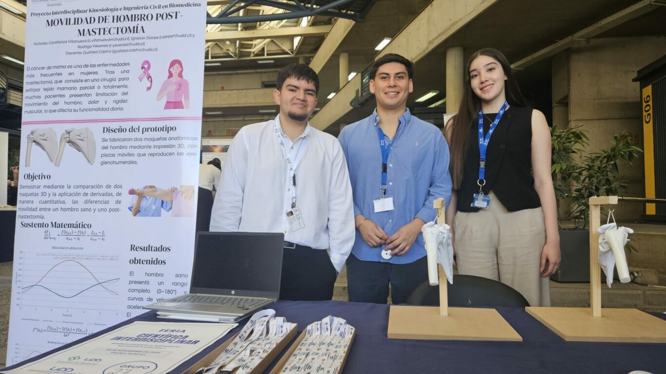 Este miércoles 19 de noviembre, se desarrolló la tercera Feria Científica Interdisciplinaria del curso Biofísica Aplicada al Movimiento, una instancia que reunió a estudiantes de primer año de las carreras de Kinesiología e Ingeniería Civil en Biomedicina de la Universidad del Desarrollo. La actividad permitió a los alumnos presentar 32 proyectos científicos, los cuales fueron expuestos a la comunidad universitaria, demostrando creatividad, rigurosidad académica y un fuerte enfoque en soluciones aplicadas a la salud.
