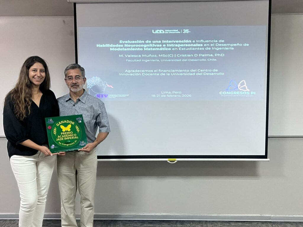 Una investigación desarrollada por Cristian Palma y Valesca Muñoz fue reconocida en el XIV Congreso Internacional de Psicología y Educación, realizado entre el 18 y el 21 de febrero de 2026 en Lima, Perú. El estudio abordó cómo diversas habilidades cognitivas e intrapersonales influyen en la capacidad de los estudiantes para formular modelos matemáticos a partir de problemas reales, una competencia clave en la formación de ingenieros.